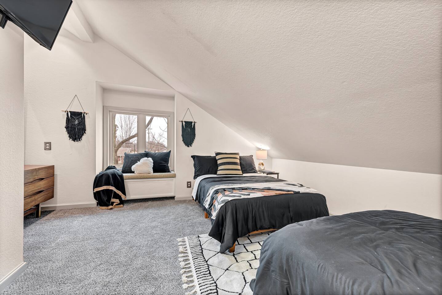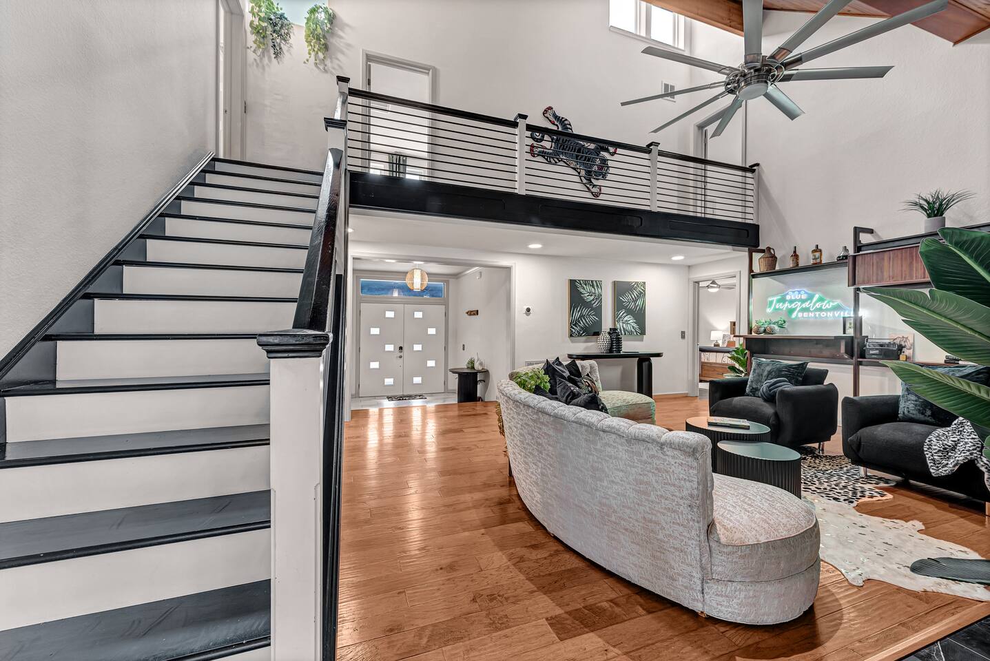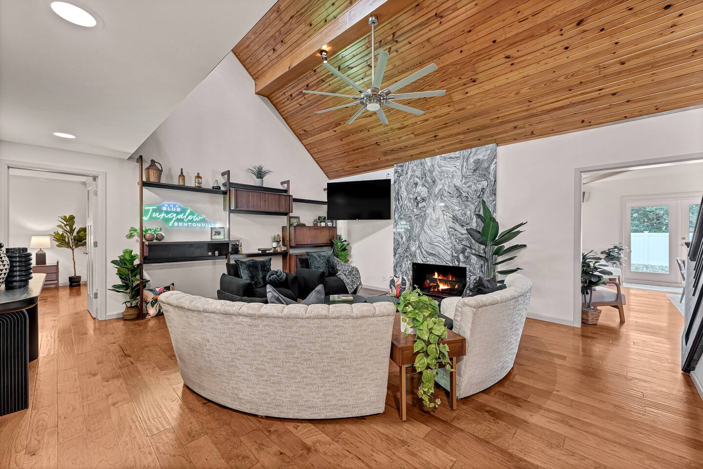 We are so excited to welcome you to the Blue Jungalow Bentonville. Centrally located a few blocks away from Downtown Bentonville, a vibrant business district offering an array of specialty shops, brewpubs, and laid-back eateries among its public art-filled, tree-lined streets. It’s home to Walmart’s world headquarters and the Walmart Museum, as well as the modern Crystal Bridges Museum of American Art, the neighboring Frank Lloyd Wright’s Bachman-Wilson House, and the Scott Family Amazeum Children’s Museum. Ready to enjoy the Mountain Biking Capital of the World? An array of biking and hiking trails are steps away from the Jungalow. Grab a cup of java at Airship Coffee at the Pumphouse located on the Zeppelin Trail before heading out for the day just 1/2 mile loop from the front door. There's so much to see and do at the Jungalow. Blue Jungalow Bentonville is a 3,110 sqft, two level home with a large dining and sun room for entertaining, cozy living space with fireplace, two primary en suite bedrooms and a large fenced in outdoor space with a 2 separate fire pits, Grill and BBQ to enjoy. Our property boasts 5 spacious bedrooms, 3 bathrooms, 1 half bath, a hidden bunk room and more! To accommodate 16+ people, we have additional queen air mattresses for 1 or 2 people each!!! More details: - 0.7 mile bike ride to Airship Coffee at the Pumphouse on ZeppelinTrail Head and Biking/Hiking Trails at Park Springs Park - 2 miles from the New Walmart Headquarters - 0.8 mile from the Downtown Bentonville Square - Mountain biker-friendly: All of the Bentonville trails are easily accessible from the house - Sleeps 16: 2 King Beds, 2 Queen Beds, 2 Full beds in the Bunk Room, 2 sleeper futon sofas & 2 queen air matresses - Fully stocked bathrooms and bedrooms - Private fenced in backyard patio with propane and BBQ grill, wood burning and propane fire pit, & al fresco dining space - 2 car garage with bike racks for parking - Fully equipped laundry room - Dedicated workspace for executive stays Coming with a large group or team for an event? We have multiple properties located Downtown Bentonville that can accommodate 10+ people each! Ask us for more information. We cannot wait to host you!