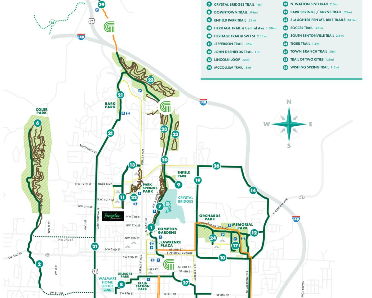Centrally located a few blocks away from Downtown Bentonville, a vibrant business district offering an array of specialty shops, brewpubs, and laid-back eateries among its public art-filled, tree-lined streets. It’s home to Walmart’s world headquarters and the Walmart Museum, as well as the modern Crystal Bridges Museum of American Art, the neighboring Frank Lloyd Wright’s Bachman-Wilson House, and the Scott Family Amazeum Children’s Museum. Ready to enjoy the Mountain Biking Capital of the World? An array of biking and hiking trails are steps away from the Jungalow. Grab a cup of java at Airship Coffee at the Pumphouse located on the Zeppelin Trail before heading out for the day just 1/2 mile loop from the front door. There's so much to see and do at the Jungalow.